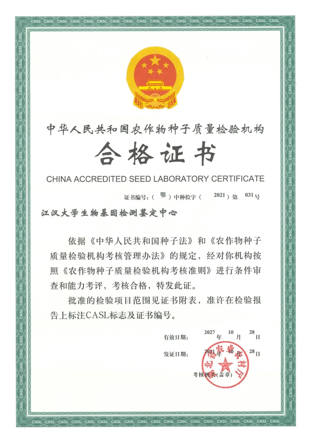 國家農(nóng)作物種子質(zhì)量檢驗(yàn)機(jī)構(gòu)(CASL)合格證書的取得,為《中華人民共和國種子法》和實(shí)質(zhì)性派生品種制度的科學(xué)實(shí)施提供了技術(shù)支撐,也為武漢創(chuàng)建“中國種都”和現(xiàn)代種業(yè)示范園提供了種業(yè)知識(shí)產(chǎn)權(quán)保護(hù)品牌。