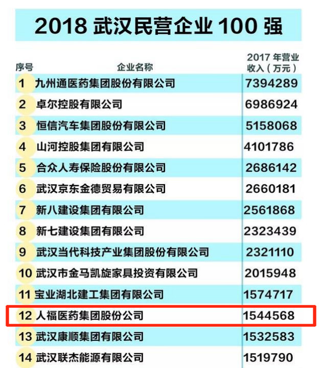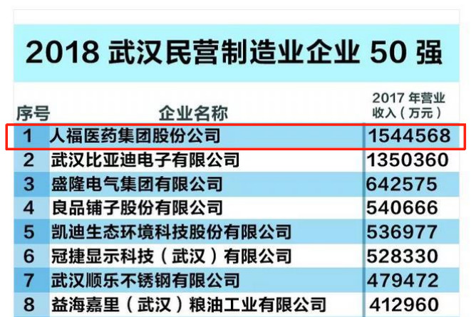 人福醫(yī)藥集團(tuán)1993年成立,是湖北省第一家上市的民營(yíng)高科技企業(yè),目前已成為湖北省醫(yī)藥工業(yè)龍頭企業(yè)、中國(guó)醫(yī)藥工業(yè)百?gòu)?qiáng)、中國(guó)民營(yíng)企業(yè)500強(qiáng)、全國(guó)科技創(chuàng)新示范企業(yè),2017年?duì)I業(yè)收入高達(dá)154.4568億元。