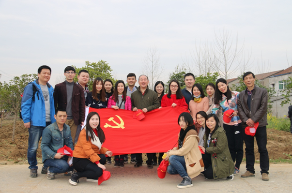 ??????? 經(jīng)過一上午的勞作,同志們的衣服濕了、鞋子臟了,將幾百顆小樹整齊地栽下,為石河村增添了一片生機勃勃的綠色。最后大家共舉黨旗,以這抹綠色為背景,在石河村留下這一珍貴的瞬間。
