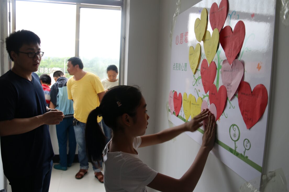 在“點(diǎn)亮微心愿”環(huán)節(jié),志愿者代表宣讀了愛(ài)心倡議書,倡議黨員、團(tuán)員和社會(huì)各界人士對(duì)于留守兒童給予更多關(guān)愛(ài),幫助他們學(xué)習(xí)、成長(zhǎng)、圓夢(mèng)。孩子們?cè)谛脑缚ㄉ险J(rèn)真寫下了自己的小小心愿,并貼在心愿墻上。志愿者代表為孩子們送去書包、筆盒、筆記本等學(xué)習(xí)用品,實(shí)現(xiàn)了他們心中的“微心愿”。