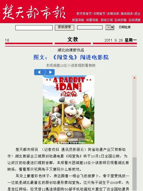 楚天都市報(bào)訊?(記者戎鈺?通訊員彭麗云)我省動(dòng)漫產(chǎn)業(yè)又有新動(dòng)作!湖北首部全三維原創(chuàng)動(dòng)漫電影《闖堂兔》將于10月1日全國(guó)公映,為讓武漢的動(dòng)漫迷們提前嘗鮮,本報(bào)看片團(tuán)誠(chéng)邀15位小讀者明日觀看湖北首映場(chǎng),看看那只宅男兔子又要玩什么新把戲。