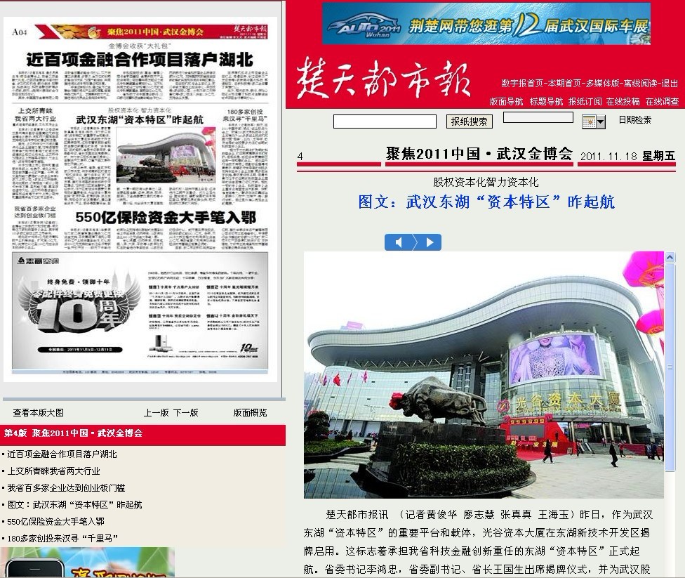今年上半年,省委、省政府和武漢市決定,將東湖高新區(qū)打造成“股權資本化、智力資本化”的“資本特區(qū)”,以科技金融創(chuàng)新促產業(yè)發(fā)展,推動東湖國家自主創(chuàng)新示范區(qū)建設,加快武漢區(qū)域金融中心建設步伐。作為區(qū)域性資本要素交易市場的重要載體,光谷資本大廈將按照“政府引導、政策扶持、企業(yè)主導、市場運作”的發(fā)展模式,建立健全資本、產業(yè)、服務等配套平臺。目前,大廈一期已有36家單位入駐,主要包括金融、證券、期貨、投資、擔保以及各類要素交易機構等十大類別。