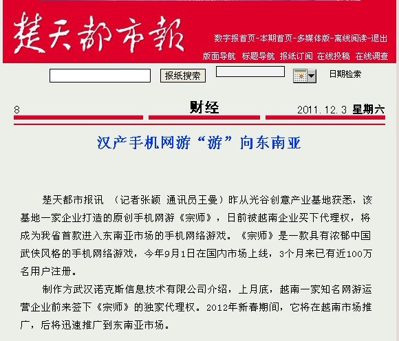 制作方武漢諾克斯信息技術(shù)有限公司介紹,上月底,越南一家知名網(wǎng)游運營企業(yè)前來簽下《宗師》的獨家代理權(quán)。2012年新春期間,它將在越南市場推廣,后將迅速推廣到東南亞市場。
