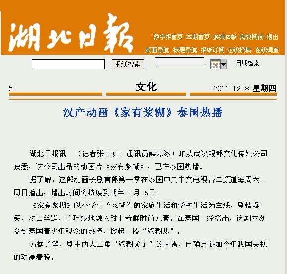湖北日?qǐng)?bào)訊 (記者張真真、通訊員薛寒冰)昨從武漢銀都文化傳媒公司獲悉,該公司出品的動(dòng)畫片《家有漿糊》,已在泰國(guó)熱播。
