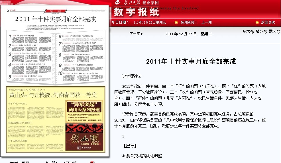 2011年政府十件實(shí)事,由一個(gè)“行”的問題(出行難)、兩個(gè)“住”的問題(老城區(qū)社區(qū)管理、平安社區(qū)建設(shè))、三個(gè)“吃”的問題(空氣質(zhì)量、醫(yī)療便民、飲水安全)、四個(gè)“群體”的問題(兒童“入園難”、農(nóng)民生活條件、殘疾人生活、老人安康)組成,分解為46個(gè)小項(xiàng)。