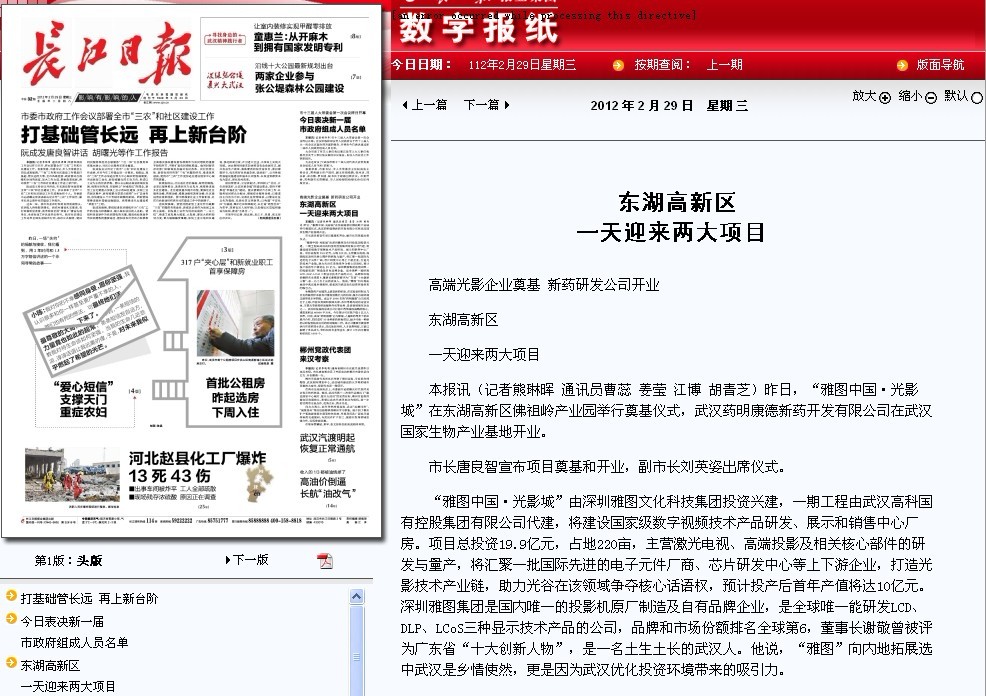 “雅圖中國·光影城”由深圳雅圖文化科技集團投資興建,一期工程由武漢高科國有控股集團有限公司代建,將建設(shè)國家級數(shù)字視頻技術(shù)產(chǎn)品研發(fā)、展示和銷售中心廠房。項目總投資19.9億元,占地220畝,主營激光電視、高端投影及相關(guān)核心部件的研發(fā)與量產(chǎn),將匯聚一批國際先進的電子元件廠商、芯片研發(fā)中心等上下游企業(yè),打造光影技術(shù)產(chǎn)業(yè)鏈,助力光谷在該領(lǐng)域爭奪核心話語權(quán),預(yù)計投產(chǎn)后首年產(chǎn)值將達10億元。深圳雅圖集團是國內(nèi)唯一的投影機原廠制造及自有品牌企業(yè),是全球唯一能研發(fā)LCD、DLP、LCoS三種顯示技術(shù)產(chǎn)品的公司,品牌和市場份額排名全球第6,董事長謝敬曾被評為廣東省“十大創(chuàng)新人物”,是一名土生土長的武漢人。他說,“雅圖”向內(nèi)地拓展選中武漢是鄉(xiāng)情使然,更是因為武漢優(yōu)化投資環(huán)境帶來的吸引力。