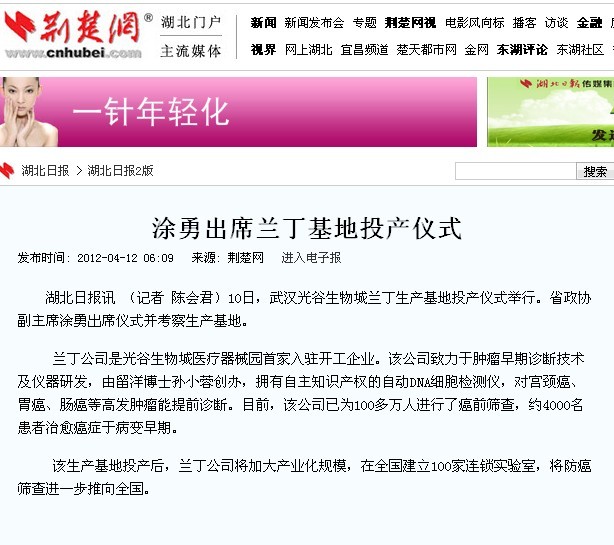 蘭丁公司是光谷生物城醫(yī)療器械園首家入駐開工企業(yè)。該公司致力于腫瘤早期診斷技術及儀器研發(fā),由留洋博士孫小蓉創(chuàng)辦,擁有自主知識產權的自動DNA細胞檢測儀,對宮頸癌、胃癌、腸癌等高發(fā)腫瘤能提前診斷。目前,該公司已為100多萬人進行了癌前篩查,約4000名患者治愈癌癥于病變早期。