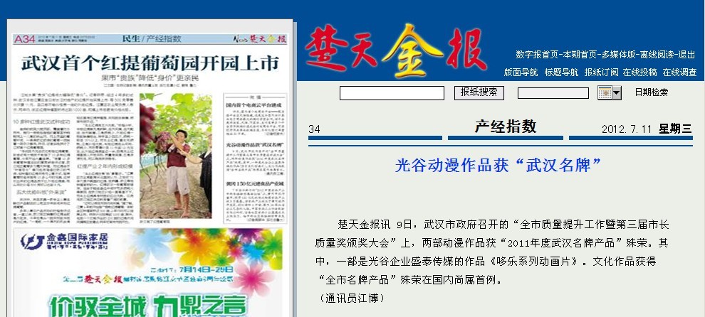 楚天金報(bào)訊?9日,武漢市政府召開的“全市質(zhì)量提升工作暨第三屆市長質(zhì)量獎頒獎大會”上,兩部動漫作品獲“2011年度武漢名牌產(chǎn)品”殊榮。其中,一部是光谷企業(yè)盛泰傳媒的作品《哆樂系列動畫片》。文化作品獲得“全市名牌產(chǎn)品”殊榮在國內(nèi)尚屬首例。