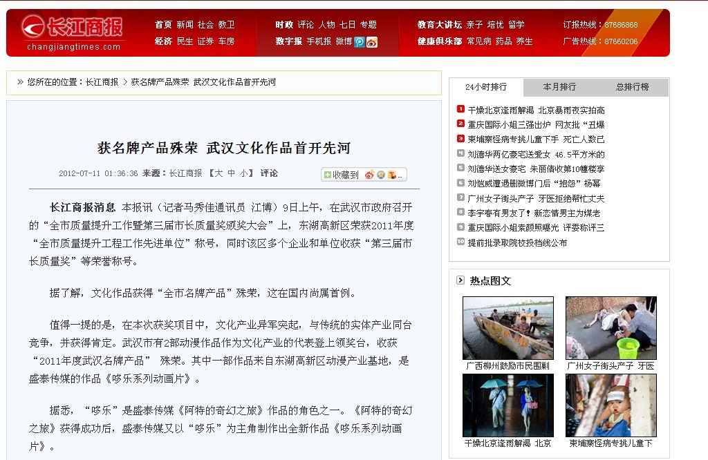 值得一提的是,在本次獲獎項目中,文化產(chǎn)業(yè)異軍突起,與傳統(tǒng)的實體產(chǎn)業(yè)同臺競爭,并獲得肯定。武漢市有2部動漫作品作為文化產(chǎn)業(yè)的代表登上領(lǐng)獎臺,收獲“2011年度武漢名牌產(chǎn)品” 殊榮。其中一部作品來自東湖高新區(qū)動漫產(chǎn)業(yè)基地,是盛泰傳媒的作品《哆樂系列動畫片》。
