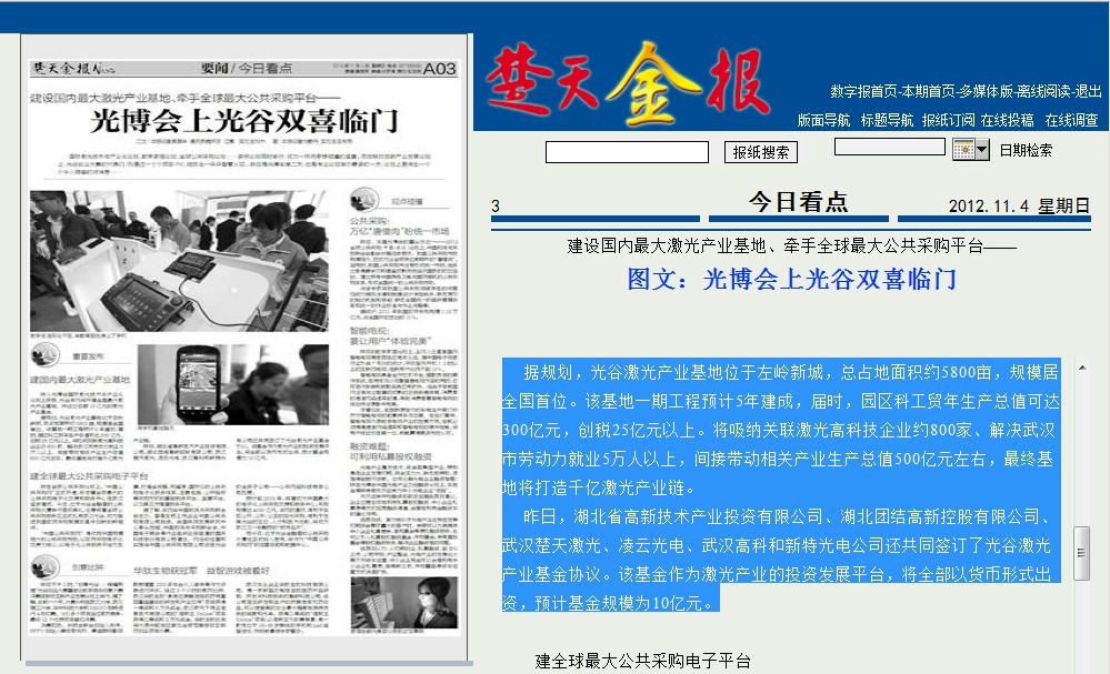 昨日,湖北省高新技術(shù)產(chǎn)業(yè)投資有限公司、湖北團(tuán)結(jié)高新控股有限公司、武漢楚天激光、凌云光電、武漢高科和新特光電公司還共同簽訂了光谷激光產(chǎn)業(yè)基金協(xié)議。該基金作為激光產(chǎn)業(yè)的投資發(fā)展平臺(tái),將全部以貨幣形式出資,預(yù)計(jì)基金規(guī)模為10億元。
