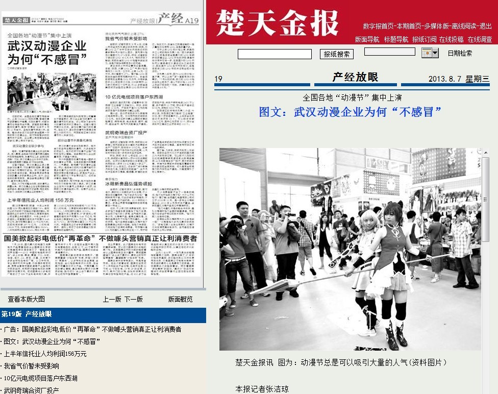 ????近段時間,全國各地動漫節(jié)相繼舉行。上海ChinaJoy剛剛閉幕,香港動漫節(jié)緊跟著拉開帷幕,沈陽動漫節(jié)、成都動漫節(jié)也相繼布臺開展。緊隨其后的青島國際動漫節(jié),南京“軟博會”也將于9月和10月舉行。各地動漫節(jié)持續(xù)火熱,但是,整體綜合實力已經(jīng)躋身全國第一方陣的武漢動漫企業(yè),卻對種類繁多的動漫節(jié)并不買賬,企業(yè)要么有選擇性地組團參加,要么根本不參加。