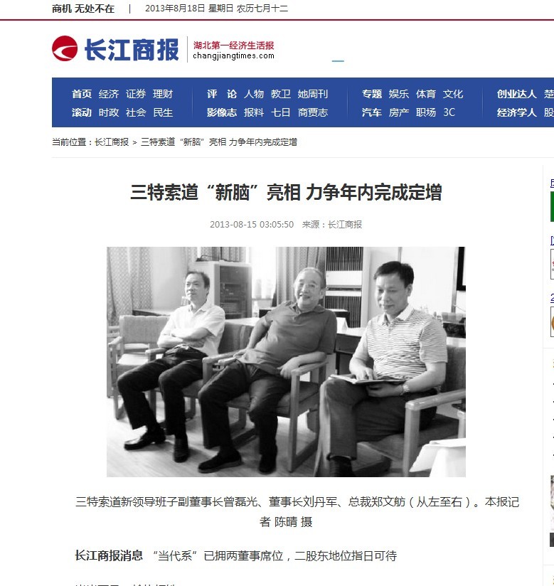 昨日下午,三特索道2013年第二次股東大會如期舉行。會上,公司新領(lǐng)導(dǎo)班子首次公開集體亮相:董事長劉丹軍、副董事長曾磊光和總裁鄭文舫。與4月份股東大會期間原董事齊民西裝革履不同,三位皆氣定神閑,全部身穿休閑T恤,劉丹軍還穿著休閑布鞋。