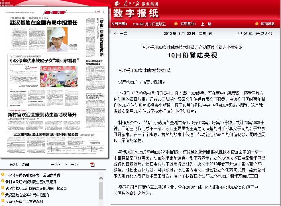 ? ? 本報訊(記者熊琳暉 通訊員杜志剛)戴上3D眼鏡,可在家中電視熒屏上感受三維立體動畫的逼真效果。記者20日從湖北盛泰文化傳媒有限公司獲悉,由該公司歷時兩年制作的3D立體動畫片《福吉小熊貓》將于10月份登陸中央電視臺3D頻道。據(jù)悉,這是我省首次采用3D立體成像技術(shù)打造的電視動畫片。