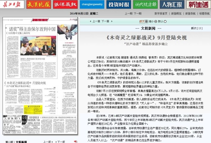 ? ? ? ? 近3年來,已有14部漢產(chǎn)動畫片登陸央視頻道。武漢市動漫協(xié)會數(shù)據(jù)顯示,2012年和2013年各有5部漢產(chǎn)動畫片登陸央視,而今年僅上半年就有4部漢產(chǎn)動畫片登陸央視。武漢動漫產(chǎn)業(yè)上半年產(chǎn)值預(yù)計超過20億元,產(chǎn)業(yè)整體實(shí)力位居全國前十。
