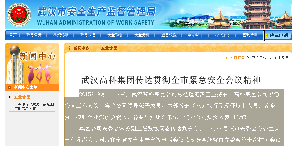 ? ? ? ? 2015年9月1日下午,武漢高科集團公司總經(jīng)理范蘊玉主持召開高科集團公司緊急安全工作會議。集團公司領(lǐng)導(dǎo)班子成員,本部各部(室)執(zhí)行副經(jīng)理以上人員;各全資、控股企業(yè)黨政負(fù)責(zé)人,各基層黨組織書記,物業(yè)公司負(fù)責(zé)人參加會議。