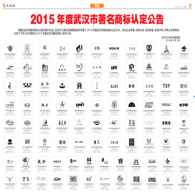 ??????? 我公司擁有注冊(cè)權(quán)和專用權(quán)的“光谷”商標(biāo),再獲“市著名商標(biāo)”。8月3日《武漢晚報(bào)》刊登“2015年度武漢市著名商標(biāo)”的認(rèn)定公告,這是繼2013年被認(rèn)定為武漢市著名商標(biāo)后,今年再獲此項(xiàng)殊榮。