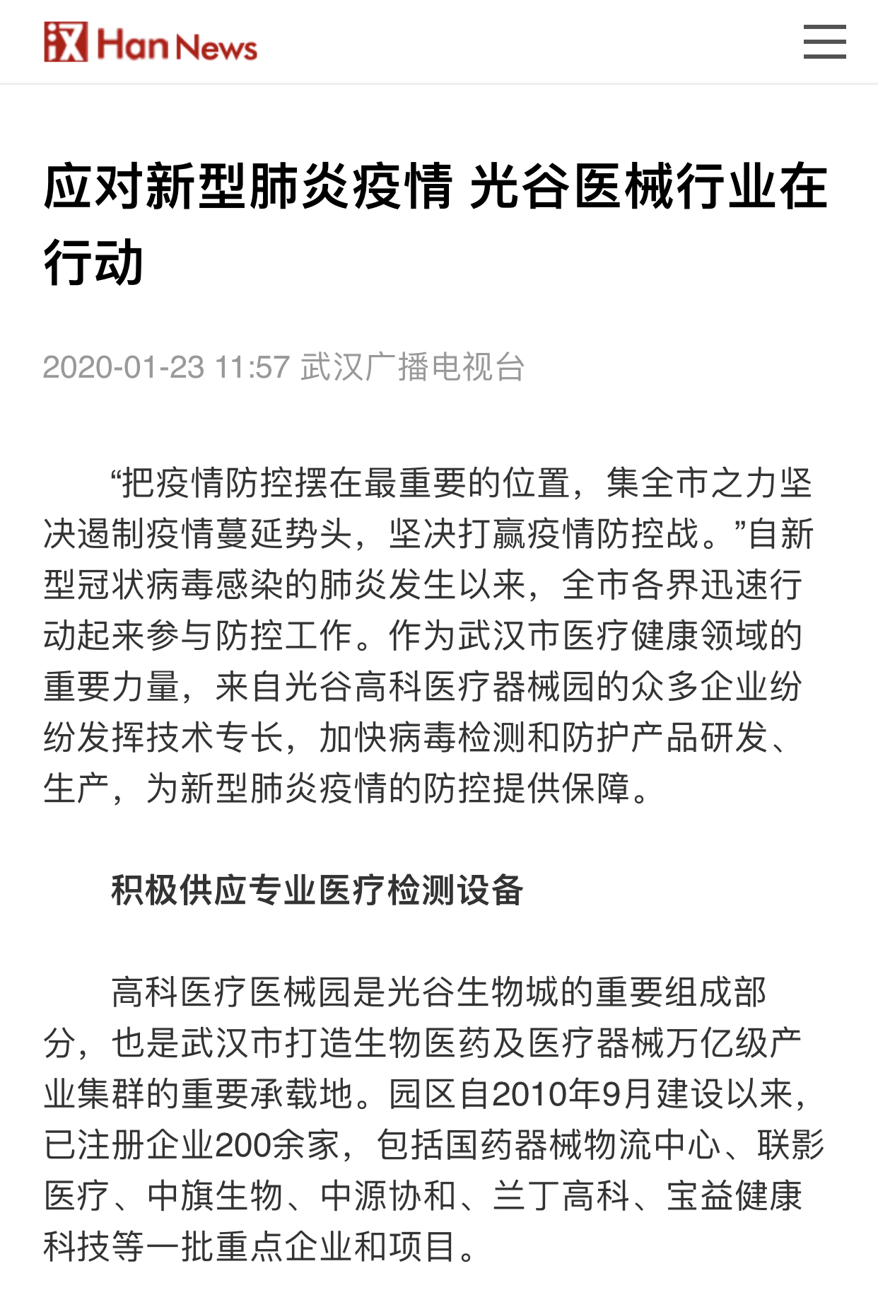 (編輯:周琛)“把疫情防控?cái)[在最重要的位置,集全市之力堅(jiān)決遏制疫情蔓延勢頭,堅(jiān)決打贏疫情防控戰(zhàn)。”自新型冠狀病毒感染的肺炎發(fā)生以來,全市各界迅速行動(dòng)起來參與防控工作。作為武漢市醫(yī)療健康領(lǐng)域的重要力量,來自光谷高科醫(yī)療器械園的眾多企業(yè)紛紛發(fā)揮技術(shù)專長,加快病毒檢測和防護(hù)產(chǎn)品研發(fā)、生產(chǎn),為新型肺炎疫情的防控提供保障。