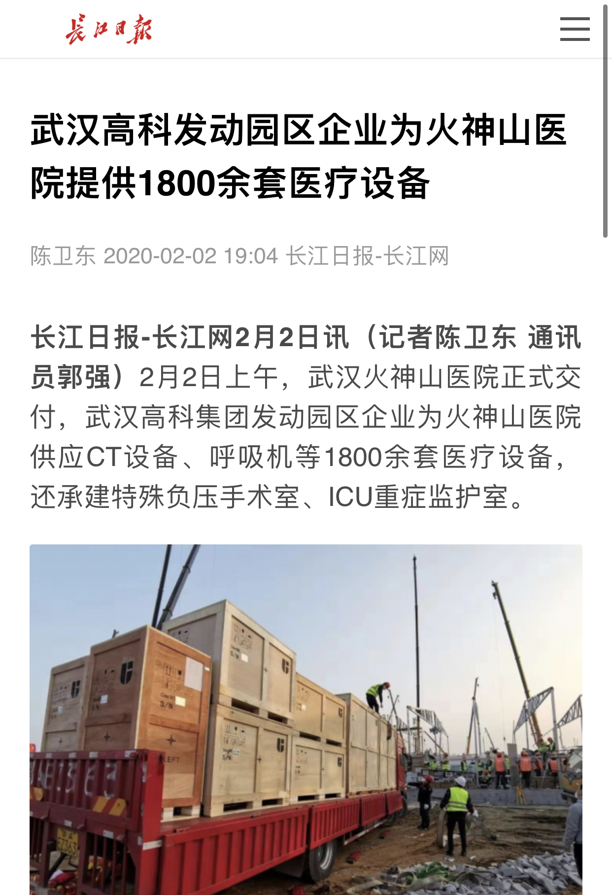 長(zhǎng)江日?qǐng)?bào)-長(zhǎng)江網(wǎng)2月2日訊(記者陳衛(wèi)東 通訊員郭強(qiáng))2月2日上午,武漢火神山醫(yī)院正式交付,武漢高科集團(tuán)發(fā)動(dòng)園區(qū)企業(yè)為火神山醫(yī)院供應(yīng)CT設(shè)備、呼吸機(jī)等1800余套醫(yī)療設(shè)備,還承建特殊負(fù)壓手術(shù)室、ICU重癥監(jiān)護(hù)室。
