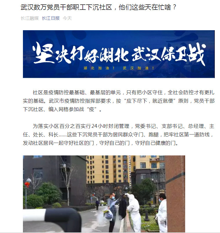 長江日報旗下長江融媒微信公眾號在《武漢數(shù)萬黨員干部職工下沉社區(qū),他們這些天在忙啥?》一文中報道武漢高科集團全資企業(yè)武漢東湖企業(yè)管理有限公司總經(jīng)理王蔚謙,下沉在關東街長山社區(qū)服務,組織發(fā)動社區(qū)40名黨員組成志愿者服務隊,為居民團購生活物資,保障日常生活等有關事宜。