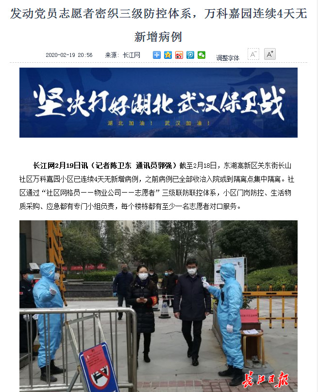長(zhǎng)江網(wǎng)2月19日訊(記者陳衛(wèi)東?通訊員郭強(qiáng))截至2月18日,東湖高新區(qū)關(guān)東街長(zhǎng)山社區(qū)萬科嘉園小區(qū)已連續(xù)4天無新增病例,之前病例已全部收治入院或到隔離點(diǎn)集中隔離。社區(qū)通過“社區(qū)網(wǎng)格員——物業(yè)公司——志愿者”三級(jí)聯(lián)防聯(lián)控體系,小區(qū)門崗防控、生活物質(zhì)采購(gòu)、應(yīng)急都有專門小組負(fù)責(zé),每個(gè)樓棟都有至少一名志愿者對(duì)口服務(wù)。