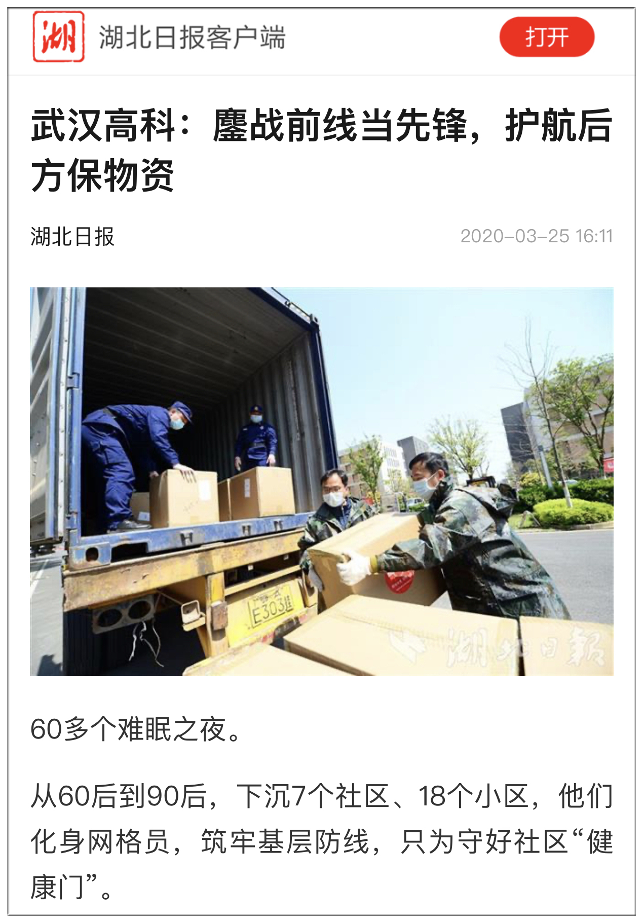60多個(gè)日夜,30多名武漢高科黨員、退伍軍人組成的裝卸隊(duì),日均工作14個(gè)小時(shí),各類(lèi)應(yīng)急物資周轉(zhuǎn)量累計(jì)1600萬(wàn)件,最高日裝卸量300噸。為疫情防控和社區(qū)封閉管理提供了堅(jiān)實(shí)物質(zhì)保障。(文/圖 湖北日?qǐng)?bào)全媒記者田悅)
