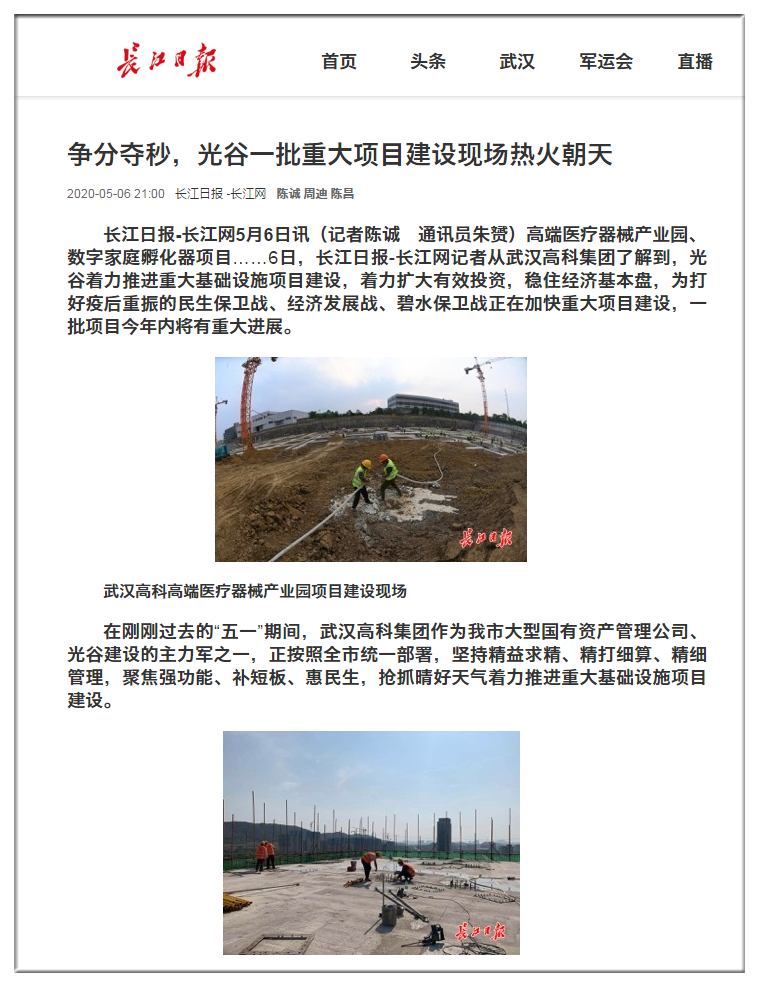 長江日報-長江網(wǎng)5月6日訊(記者陳誠 通訊員朱赟)高端醫(yī)療器械產(chǎn)業(yè)園、數(shù)字家庭孵化器項目……6日,長江日報-長江網(wǎng)記者從武漢高科集團了解到,光谷著力推進重大基礎設施項目建設,著力擴大有效投資,穩(wěn)住經(jīng)濟基本盤,為打好疫后重振的民生保衛(wèi)戰(zhàn)、經(jīng)濟發(fā)展戰(zhàn)、碧水保衛(wèi)戰(zhàn)正在加快重大項目建設,一批項目今年內將有重大進展。