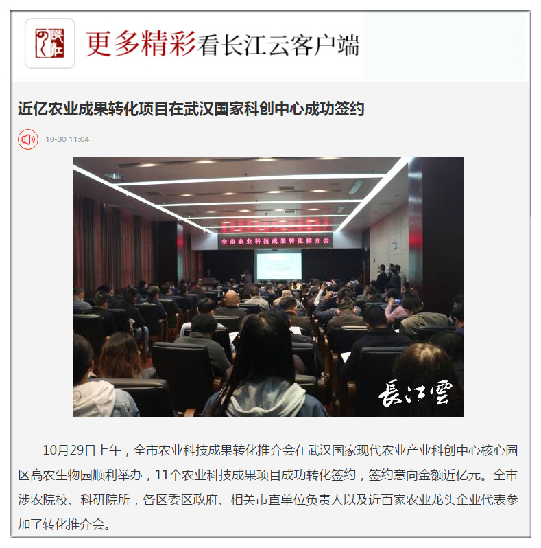 10月29日上午,全市農(nóng)業(yè)科技成果轉(zhuǎn)化推介會(huì)在武漢國(guó)家現(xiàn)代農(nóng)業(yè)產(chǎn)業(yè)科創(chuàng)中心核心園區(qū)高農(nóng)生物園順利舉辦,11個(gè)農(nóng)業(yè)科技成果項(xiàng)目成功轉(zhuǎn)化簽約,簽約意向金額近億元。全市涉農(nóng)院校、科研院所,各區(qū)委區(qū)政府、相關(guān)市直單位負(fù)責(zé)人以及近百家農(nóng)業(yè)龍頭企業(yè)代表參加了轉(zhuǎn)化推介會(huì)。