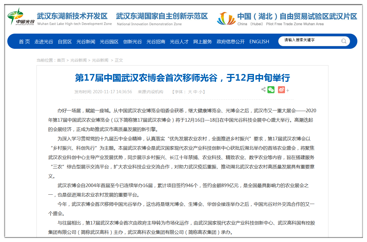 東湖高新區(qū)政務(wù)網(wǎng):第17屆中國(guó)武漢農(nóng)博會(huì)首次移師光谷,于12月中旬舉行