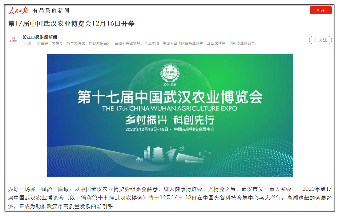 人民日?qǐng)?bào):第17屆中國(guó)武漢農(nóng)業(yè)博覽會(huì)12月16日開幕