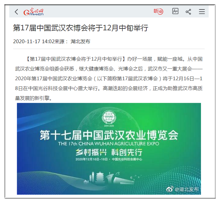光明網(wǎng):第17屆中國(guó)武漢農(nóng)博會(huì)將于12月中旬舉行