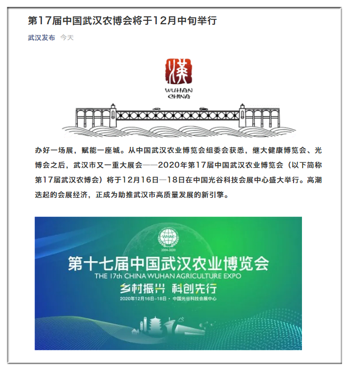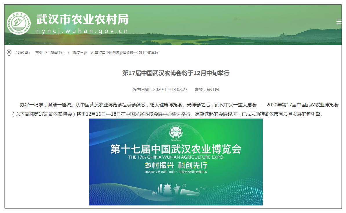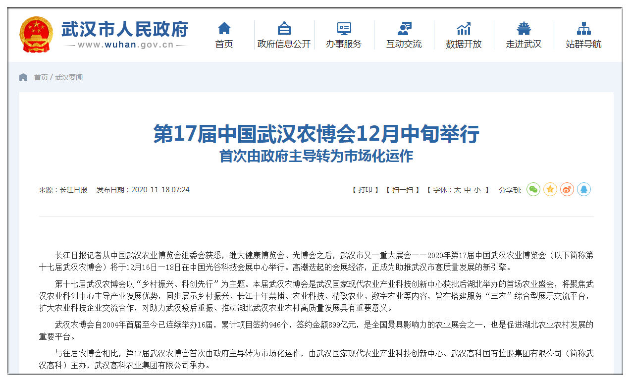 武漢市人民政府官網(wǎng):第17屆中國(guó)武漢農(nóng)博會(huì)12月中旬舉行?首次由政府主導(dǎo)轉(zhuǎn)為市場(chǎng)化運(yùn)作