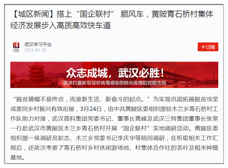 “我們希望能牢牢抓住這次‘國企聯(lián)村’結(jié)對幫扶行動契機,特別是能借武漢高科集團的先進理念和市場大平臺,給予我們一些技術(shù)、資金、信息、銷售渠道等方面的支持,全力推進我們村的產(chǎn)業(yè)再升級,村集體經(jīng)濟再壯大,實現(xiàn)我們村農(nóng)民逐年增收7%的奮斗目標。”青石橋村黨支部書記陳建勛高興地說道。