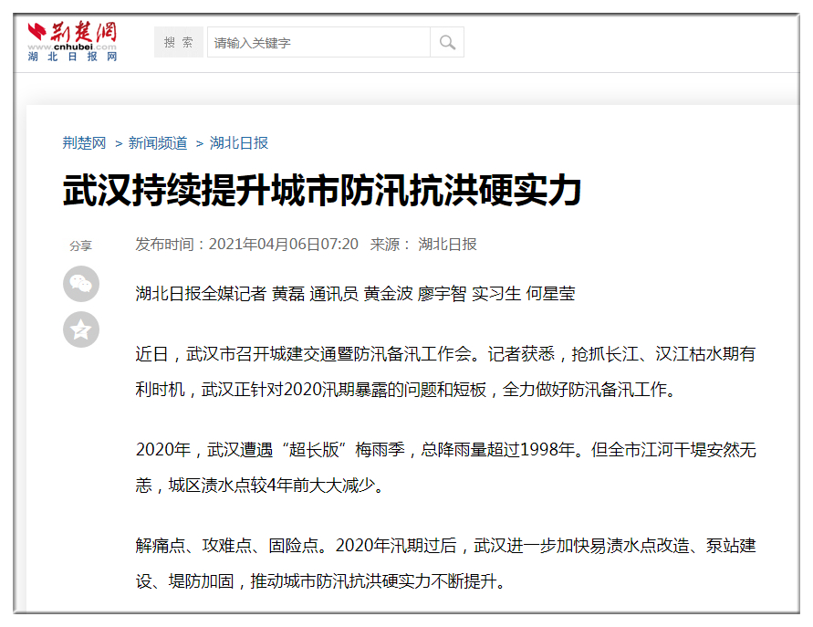 湖北日?qǐng)?bào):武漢持續(xù)提升城市防汛抗洪硬實(shí)力