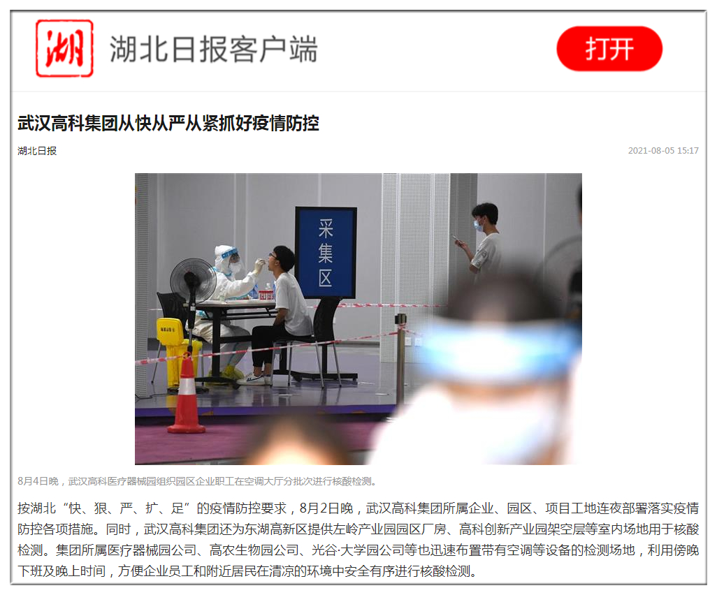 按湖北省“快、狠、嚴、擴、足”的疫情防控要求,8月2日晚,武漢高科集團所屬企業(yè)、園區(qū)、項目工地連夜部署落實疫情防控各項措施。同時,武漢高科集團還為東湖高新區(qū)提供左嶺產(chǎn)業(yè)園園區(qū)廠房、高科創(chuàng)新產(chǎn)業(yè)園架空層等室內(nèi)場地用于核酸檢測。集團所屬醫(yī)療器械園公司、高農(nóng)生物園公司、光谷·大學園公司等也迅速布置帶有空調(diào)等設備的檢測場地,從8月2日晚至5日發(fā)稿時,利用傍晚下班及晚上時間,方便企業(yè)員工和附近居民在清涼的環(huán)境中安全有序進行核酸檢測。