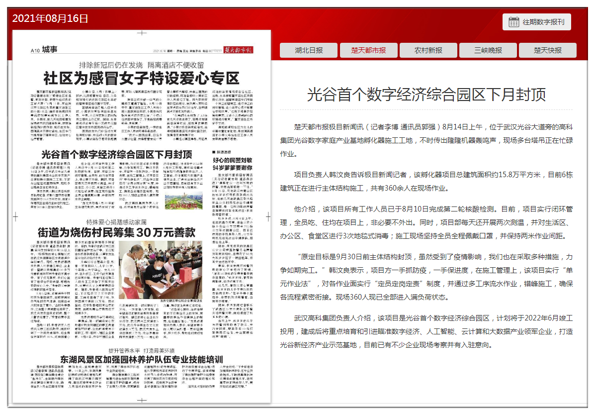 武漢高科集團(tuán)負(fù)責(zé)人介紹,該項(xiàng)目是光谷首個(gè)數(shù)字經(jīng)濟(jì)綜合園區(qū),計(jì)劃將于2022年6月竣工投用,建成后將重點(diǎn)培育和引進(jìn)瞄準(zhǔn)數(shù)字經(jīng)濟(jì)、人工智能、云計(jì)算和大數(shù)據(jù)產(chǎn)業(yè)領(lǐng)軍企業(yè),打造光谷新經(jīng)濟(jì)產(chǎn)業(yè)示范基地,目前已有不少企業(yè)現(xiàn)場(chǎng)考察并有入駐意向。