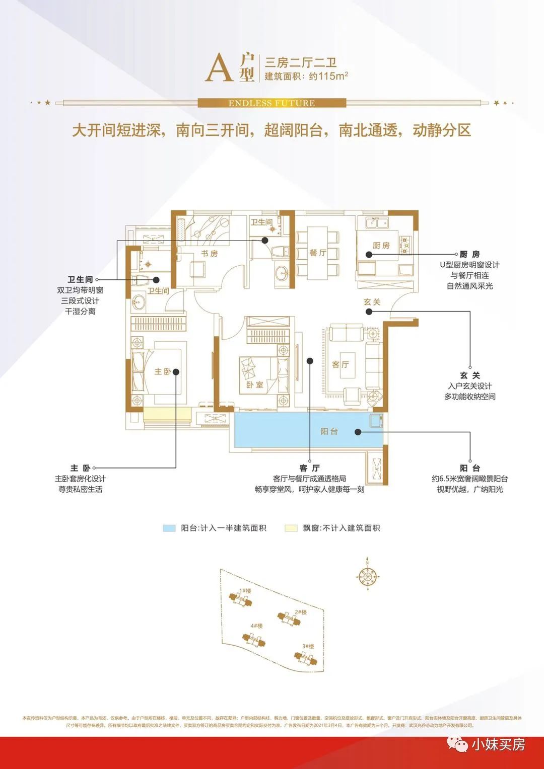 ? ? ? 建面約115平戶型:主臥套間設(shè)計,而且一線貫穿,空間比較闊綽,主臥套房設(shè)計,帶獨立衛(wèi)生間,私密性更好??蛷d與南向次臥連接一個約6.5米景觀大陽臺,觀景、晾曬、采光都比較不錯,可滿足三代同堂居住需求!