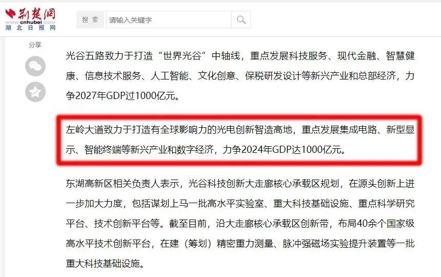 根據規(guī)劃,光谷“光芯屏端網”產業(yè)集群的主要陣地將東擴到未來科技城。貫穿未來科技城的左嶺大道,將致力于打造有全球影響力的光電創(chuàng)新智造高地,重點發(fā)展集成電路、新型顯示、智能終端等新興產業(yè)和數字經濟,力爭2024年GDP達1000億元。